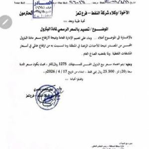 أعلنت شركة النفط اليمنية، في بيان صادر عنها قبل قليل رفع أسعار مادتي الديزل والبترول، وذلك على خلفية التطورات الإقليمية. وفيما يلي نص البيان ... بيان هام:منذ انطلاق الأزمة والحرب في من...