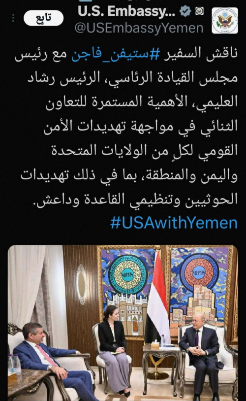 رصد موقع محرر "شبوة برس" تغريدة رسمية نشرتها السفارة الأمريكية لدى اليمن على حسابها في منصة إكس، أوضحت فيها أن السفير الأمريكي ستيفن فاجن ناقش مع رئيس مجلس القيادة الرئاسي رشاد العليمي أهمية استمرار التعاون الثنائي في مواجهة تهديدات الأمن القومي للولايات المتحدة واليمن والمنطقة، بما في ذلك تهديدات الحوثيين وتنظيمي القاعدة وداعش، دون أن تتضمن التغريدة أي إشارة إلى دعم ما يسمى وحدة اليمن أو سلامة أراضيه.