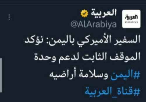 وبحسب متابعة محرر "شبوة برس"، فقد نشرت قناة العربية تغريدة منسوبة للسفير الأمريكي زعمت فيها تأكيده على الموقف الثابت لدعم وحدة اليمن وسلامة أراضيه، وهو ما يتناقض كليًا مع النص الرسمي الصادر عن السفارة الأمريكية، الذي خلا تمامًا من هذا المضمون.