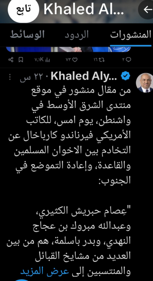وأضاف كارباخال أن الصور المتداولة أواخر يناير، والتي تظهر اجتماعًا بين الكثيري وأبو عمر في سيئون، تُستشهد بها لتعزيز مزاعم وجود تواطؤ بين حزب الإصلاح والتنظيم، دون أن يشير المقال إلى وجود أي حكم قضائي أو تصنيف رسمي لهذه الشخصيات كإرهابية.