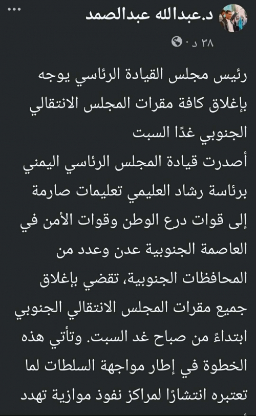 رصد محرر "شبوة برس" ما نشره الدكتور عبدالله عبدالصمد، السياسي الجنوبي، بشأن توجيهات منسوبة لرئيس مجلس القيادة الرئاسي رشاد العليمي تقضي بإغلاق كافة مقرات المجلس الانتقالي الجنوبي في عدن وعدد من المحافظات الجنوبية ابتداءً من صباح السبت، عبر تكليف قوات درع الوطن وقوات أمنية بتنفيذ القرار.