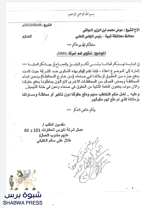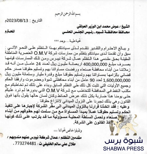 هذا الظلم وعدم المساواة بين العمال من قبل شركة O. M. V النفطية دفع العمال من أبناء محافظتي شبوة وحضرموت إلى القيام برفع شكوى ضد الشركة في تاريخ 2023/5/4م إلى الشيخ عوض محمد بن الوزير محافظ محافظة شبوة رئيس المجلس المحلي بالمحافظة بهذا الخصوص والذي بدوره قام بإحالة الموضوع إلى مدير عام مكتب النفط بالمحافظة للمتابعة ولكن بدون جدوى وهو ما دفع العمال إلى القيام بتاريخ 2023/8/13م برفع مذكرة أخرى إلى الشيخ عوض محمد بن الوزير محافظ محافظة شبوة ابلغوه فيها بالمشكلة وان الشركة لم ترد على مخاطباتكم لها وعلية فقد اتخذنا قرارنا بالنزول الميداني إلى مقر الشركة لاجبارها على تنفيذ الحكم وتسليم حقوقنا عملا بمبدأ المساواة مع من سلمت لهم حقوقهم من أبناء محافظة صنعاء ونحمل السلطة المحلية مسؤولية ماقد يترتب على ذلك كونها عجزت عن إنفاذ القانون على الشركة ولازالت السلطة تجري محاولات مع العمال لثنيهم عن النزول إلى موقع الشركة في الوقت الذي هي عاجزة فية عن فعل لهم اي شي حيال استمرار عدم صرف الشركة لمستحقاتهم .