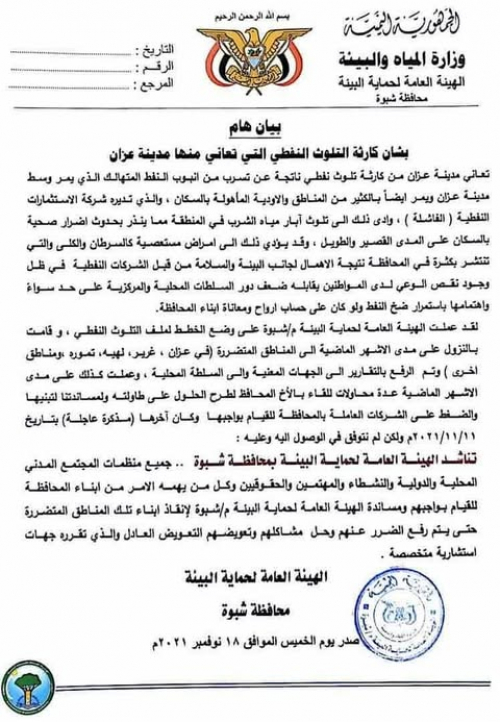 المراسلات الحكومية من مكتب الهيئة ايام مجور او الصادرة عن الهيئة البيئية ليست بيانًا صحفيًا، بل وثيقة رسمية تُدين وزارة النفط ومحافظ شبوة وهيئة الاستكشافات، وتكشف كيف يتم تسخير مؤسسات الدولة لخدمة الفساد على حساب البيئة والإنسان.