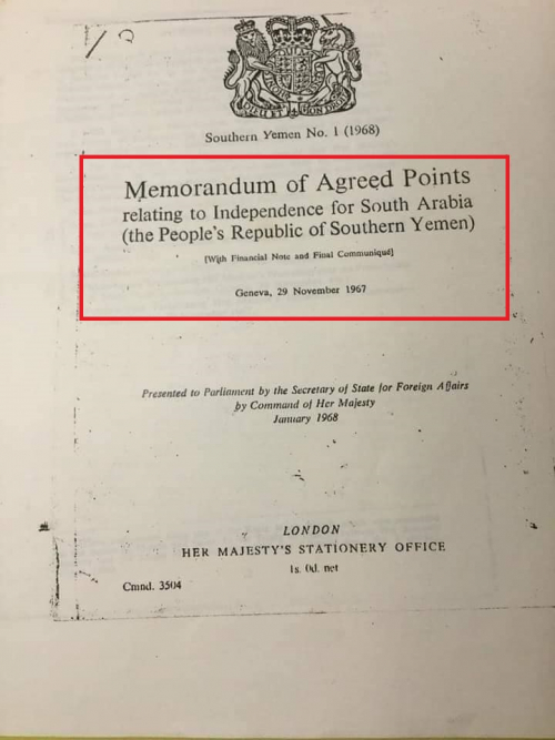 البند الأول : يحصل الجنوب العربي على الاستقلال في 30 نوفمبر1967 ويُشار إلى هذا اليوم فيما يلي بيوم الاستقلال.