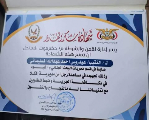 وخلال اللقاء، قام العقيد المشجري بتسليم شهادة شكر وتقدير للنقيب السليماني، نيابةً عن إدارة الأمن وشرطة محافظة حضرموت - الساحل، وذلك تقديراً لجهوده المبذولة وتعاونه المثمر مع رجال أمن مديرية المكلا في مجال مكافحة الجريمة وضبط المطلوبين.