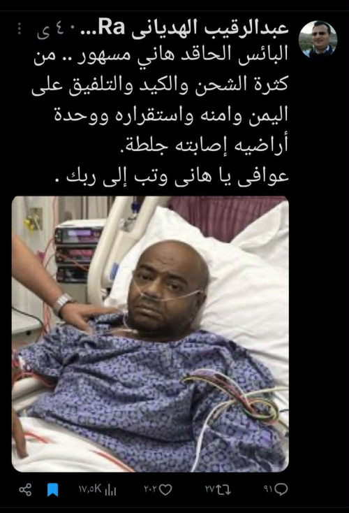 والتي نشرها منذ خمسة أيام ولم يعتذر عنها أو يحذفها ولا تزال مثبتة على حسابه في منصة إكس حتى بعد صلاة العشاء ليومنا هذا الجمعة 12 ديسمبر 2025 وقال وأكد تطاوله على شأن إلهي يختص به الله سبحانه وتعالى وهو اللطيف بعباده, قال إن الكاتب الجنوبي هاني مسهور أصيب بجلطة بسبب ما وصفه بـ“الكيد والتلفيق على اليمن”، وهو خطاب يعكس استهتارًا صادمًا بحرمة المرض واختصاص الله وحده بتقدير الأقدار، ويكشف عقلية إعلامية تسعى لتحويل كل ابتلاء إلى مادة للشماتة والتحريض ضد الخصوم.