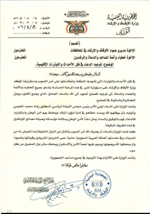 محرر "شبوة برس" ينشر نص توجيه الوزير الوادعي، وهو أحد أبرز خريجي معهد دماج السلفي وأحد أقرباء وتلاميذ الشيخ مقبل بن هادي الوادعي، يأتي توجيهه هذا في سياق سياسي وديني حساس، حيث يراه مراقبون محاولة لفرض وصاية دينية وسياسية على الجنوبيين، في وقت تشهد فيه مناطقهم توترات أمنية واستهدافات متبادلة وأمره هذا لن ينفذ في الجمهورية العربية اليمنية لسيطرة الحوثي عليها.