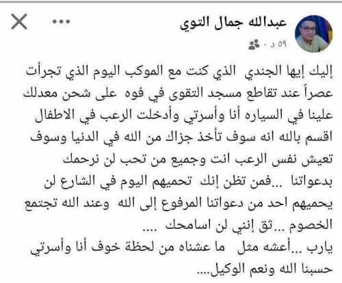 وأكد العباسي أن هذا الفعل يعكس خللًا فادحًا في الانضباط العسكري، ويشكل تهديدًا مباشرًا للأمن المدني، ويضع المدنيين تحت رعب دائم، مما يجعل أي وعد بحماية المجتمع بلا معنى إذا استمر مثل هذا السلوك.