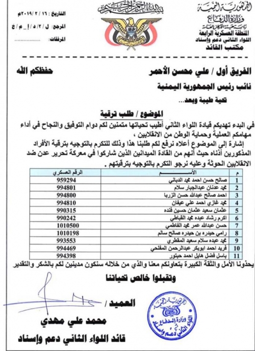فضحت وثيقة مسربة تبعية ما يعرف بقوات الحرس الرئاسي في العاصمة الجنوبية عدن، الأمر الذي يعزز تقارير نشرتها" اليوم الثامن" عدم امتلاك الرئيس اليمني الانتقالي عبدربه منصور هادي المعترف به دوليا. وتداول ناشطون جنوبيون وثيقة صادرة عن قائد عسكري للواء في عدن يناشد بها نائب رئيس الجمهورية بمنح عدد من افرده رتبا عسكرية. ورفع قائد اللواء الثاني دعم واسناد وهو لواء تابع عملياتيا للحماية الرئاسية محمد علي مهدي سقراط رفع طلبا لنائب الرئيس اليمني علي محسن الأحمر يناشده بمنح 11 جنديا من افراده ترقيات عسكرية.