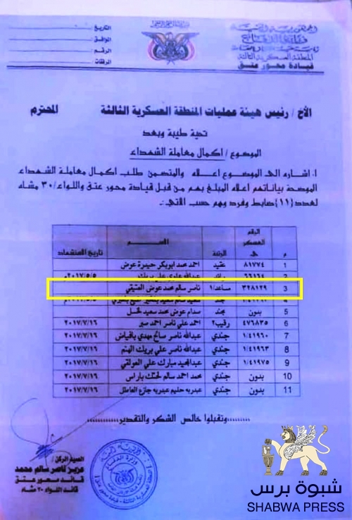 حصل محرر "شبوه برس" على صورة من وثيقة مسربة أن قائد محور عتق قائد اللواء 30 أقدم على إدراج اسم والده المتوفى منذ قبل أكثر من ثلاثين عاما في محافظة البيضاء اليمنية إلى كشف تم رفعه إلى قيادة المنطقة الثالثة في مأرب ويضم قائمة بأسماء الشهداء من الضباط والجنود المنتسبين لمحور عتق وتدعي الوثيقة أنهم سقطوا في مواجهة الحوثي العام 2017م .