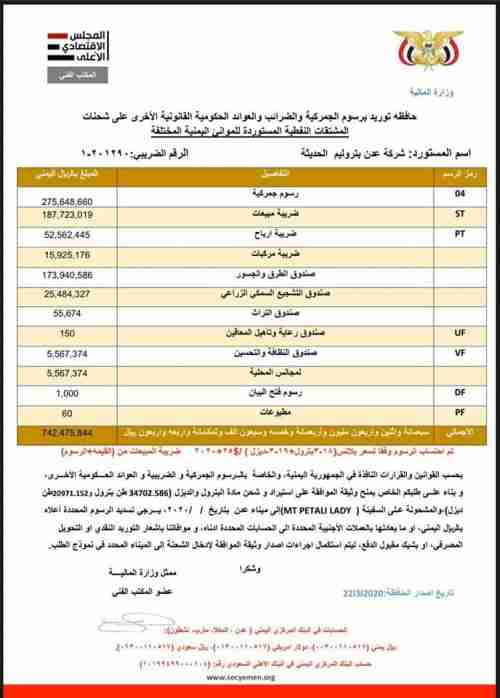 وتعود البيانات لشحنتين من المشتقات النفطية دخلتا عبر ميناء عدن مؤخراً ، إحداهما تتبع شركة عدن بتروليوم لمالكها أحمد العيسي والأخرى شركة فامبا ويملكها تاجر يدعى أحمد حمران.