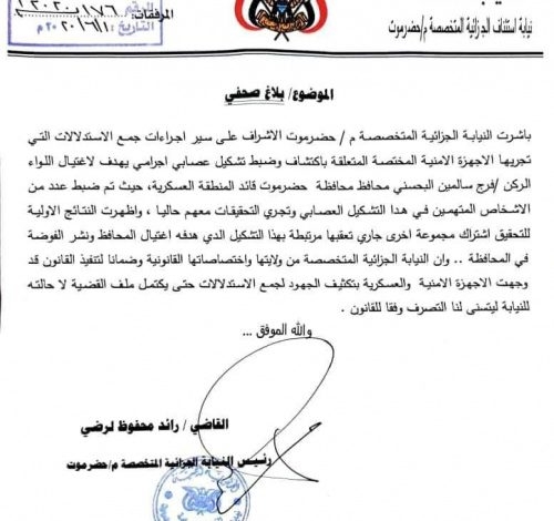 كلنا مع أمن حضرموت، وضد أي تعدٍ على استقرارها، أو استهداف مسؤوليها أو مواطنيها على حد سواء، لكن المطلوب إجراءات قضائية مستقلة، لا بلاغات أمنية مرتبكة الصياغة لغوياً وإملائياً، تمضيها النيابة.