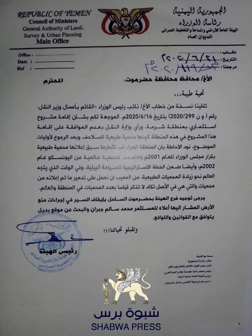 محرر "شبوة برس" حصل على معلومات من قلب الإدارة المحلية في المكلا معززة بالوثائق تدين تصرف "البحسني" المفرط والغير مدرك للتاريخ والحفاظ على البيئة والحياة الفطرية .
