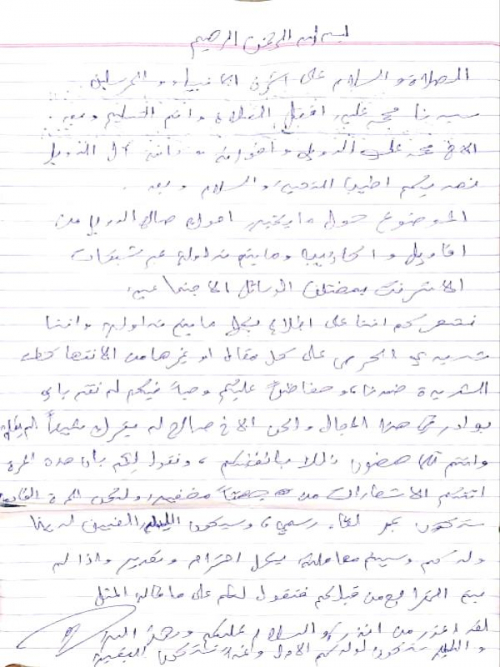 وقال له اتصل بعمك محمدعلي الدويل وقل له اننا وضعنا له رسالة في سيارته وفعلا وجدناها مليئة بالتهديد بالتصفيات لنا ولاولادنا على خلفية كتاباتي*