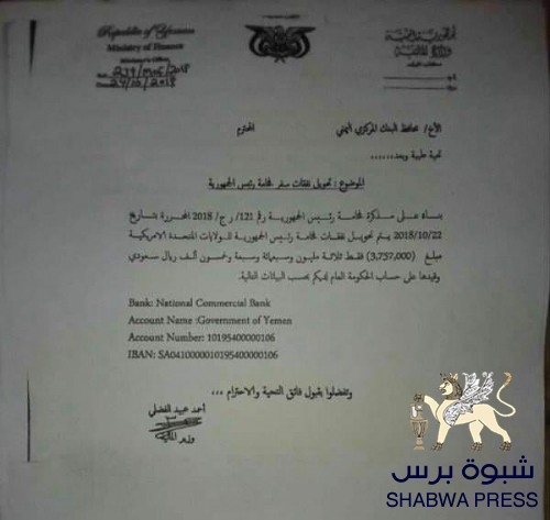 نشر كاتب وناشر صحفي وثيقة رسمية تثبت أن المدعو "عبدالله كورش العليمي" مدير مكتب رئيس الشرعية اليمنية في المهجر قد أستحوذ على مبلغ ثلاثة ملايين وسبعمائة وخمسين ألف ريال سعودي لتغطية رحلته إللا الولايات المتحدة الأمريكية لقضاء عدة أيام فقط .