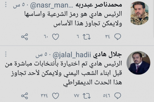 وجاء في تغريدة جلال عبد ربه هادي، “الرئيس هادي تم اختياره بأنتخابات مباشرة من قبل ابناء الشعب اليمني ولايمكن لأحد تجاوز هذا الحدث الديمقراطي”.