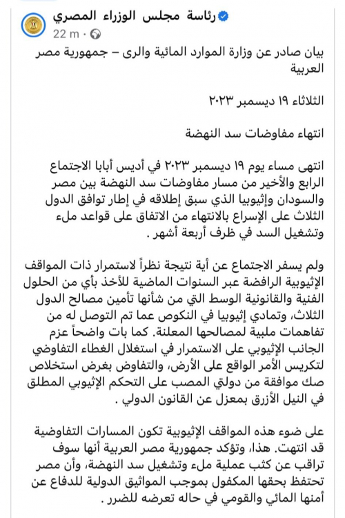 مصر تعلن رسميا نهاية مفاوضاتها مع أثيوبيا وتحتفظ بحق الرد وحماية أمنها المائي..