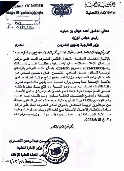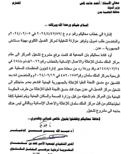 وزير الصحة في حكومة شرعية اللصوص اليمنيين المشردين الدكتور "قاسم "حيبح المرداي" وعبر شخص يمني مكلف من قبله بالقيام بالمهام القذرة يدعى "د حسين الغانمي" منسق البرامج الصحية اليمنية بمركز الملك سلمان للأعمال الإنسانية قام بمخاطبة مركز سلمان بخطاب رسمي بعدم حاجة مركز غسيل الكلى بمستشفى الجمهورية بعدن لأي معونة سعودية أو القيام بتشغيل مركز الكلى"