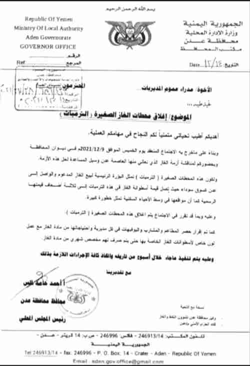الوثيقة، التي تحمل تاريخ 15 ديسمبر 2021، تؤكد توجيهات المحافظ بإغلاق محطات الغاز الصغيرة بسبب مخاطرها الكبيرة على سلامة السكان في المناطق السكنية، وقد حث المحافظ على تنفيذ هذه القرارات خلال أسبوع من تاريخ التوجيه واتخاذ كافة الإجراءات اللازمة لضمان سلامة المواطنين.