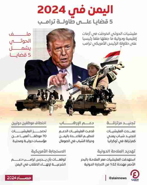 ومع إسدال عام 2024 ستاره تسلط "العين الإخبارية" الضوء على أهم القضايا الشائكة في الملف اليمني، التي تجعله أحد أهم الملفات الحاسمة للرئيس الأمريكي المنتخب، الذي سبق ودعم جهود تحالف دعم الشرعية باليمن واتخذ إجراءات مشددة ضد الحوثيين.