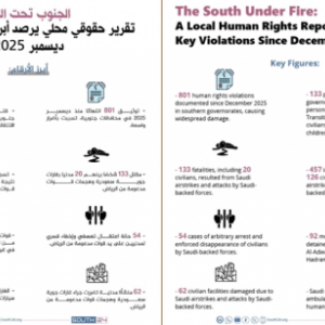 *- شبوة برس – هاني مسهوركشف تقرير حقوقي محلي عن تصاعد الانتهاكات في محافظات الجنوب منذ ديسمبر 2025، في ظل توترات أمنية وسياسية متزايدة. وأوضح التقرير أن الانتهاكات شملت سقوط قتلى وجرحى نتيج...