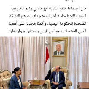 شبوة برس – خاصنشرت سفيرة المملكة المتحدة لدى اليمن تغريدة على نافذتها الرسمية في منصة إكس، رصدها محرر شبوة برس، تحدثت فيها عن لقاء وصفته بالمثمر مع وزير خارجية اليمن شائع الزنداني، جرى خلاله بحث...