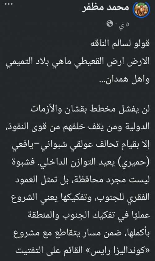 وقال مظفر في تدوينة نشرها على حسابه في منصة فيسبوك، رصدها محرر شبوة برس، مخاطبًا خصوم شبوة ومشاريعهم: “قولوا لسالم الناقة، الأرض أرض القعيطي، ما هي بلاد التميمي ولا أهل همدان”، في إشارة مباشرة إلى محاولات فرض نفوذ سياسي وقبلي على المحافظة خارج سياقها التاريخي والجغرافي.