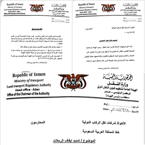 أصدرت هيئة تنظيم شؤون النقل البري تعميمات قضى الأول بالزام جميع شركات النقل البري بوقف تسيير رحلاتها إلى السعودية حتى تاريخ يوم غد 9 مارس ، على أن يتم تنظيم وجدولة الرحلات تفاديا للازدحام في منفذ الوديعة .