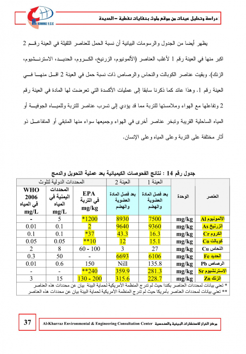 - النتائج لتحليل العينات كانت ذات مؤشرات خطيرة حيث شملت تركيزات عالية جدا تتجاوز المسموح به دوليا بعشرات الاضعاف للزرنيخ والكروم والكوبالت وهي عناصر سامة.