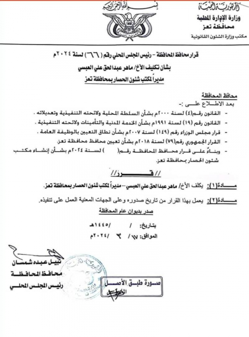 وجاء في وثيقة نشرها الأستاذ "احمد سعيد كرامة" صورة لوثيقة قرار لمحافظ تعز "نبيل عبده شمسان" بتعيين "ماهر عبدالحق علي العبسي" مديرا عامآ لشئون الحصار".