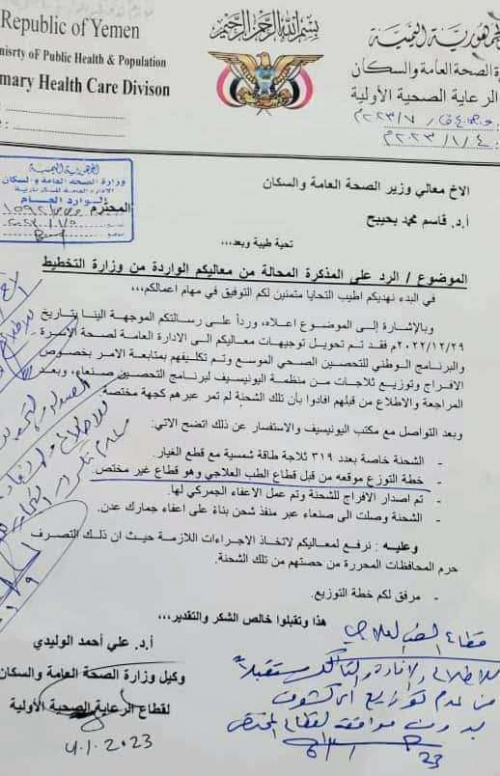 وأشارت الوثيقة إلى أن توجيهات الوزير القاضية بالبت في قضية الشحنة تم تحويلها إلى الإدارة العامة لصحة الأسرة والبرنامج الوطني للتحصين الصحي الموسع وتكليفهم بها، حيث تم الرد عليهم بأن الشحنة لم تمر عبرهم كجهة خاصة.