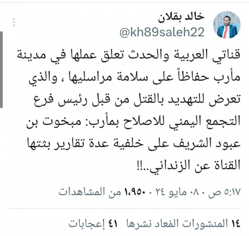 وقال بقلان: "العربية والحدث تعلق عملها في مارب حفاظاً على سلامة مراسليها".. موضحاً بأن المراسل : " تعرض للتهديد بالقتل من قبل رئيس فرع التجمع اليمني للاصلاح بمأرب: مبخوت بن عبود الشريف على خلفية عدة تقارير بثتها القناة عن الزنداني..!!".
