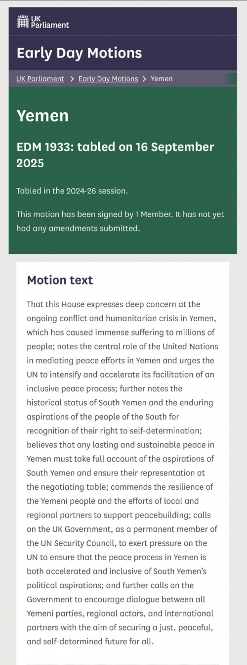 ويُنظر إلى هذه الخطوة على أنها تطور بارز في موقف البرلمان البريطاني تجاه القضية الجنوبية، وتمهيد لمناقشات أوسع داخل أروقة البرلمان حول سبل دعم السلام الشامل في اليمن وضمان تمثيل الجنوب في أي مفاوضات قاد