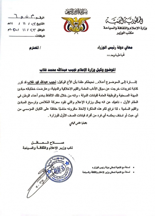 اطّلع محرر شبوة برس على مذكرة رسمية رفعها نائب وزير الإعلام والثقافة والسياحة صلاح العاقل إلى رئيس الوزراء، احتج فيها على ما وصفه بالتجاوزات المنحطة والعبارات السوقية التي دأب وكيل الوزارة نجيب غلاب على تكرارها خلال الأيام الماضية.