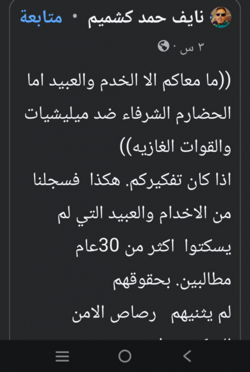 أعاد المدون الحضرمي نايف حمد كشميم نشر تدوينة لأحد مناصري الخطاب العنصري في حضرموت، بعد طمس اسمه لأسباب اجتماعية، في سياق الإدانة وكشف القبح لا الترويج له، وذلك عقب تداول عبارات طبقية مهينة تقسم المجتمع إلى شرفاء وعبيد، في إساءة صريحة للكرامة الإنسانية وللنسيج الاجتماعي الحضرمي.
