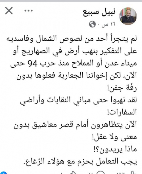 علقت الدكتورة هدى العطاس على تغريدة الكاتب اليمني نبيل سبيع الذي وصف شعب الجنوب العربي بأوصاف عنصرية بذيئة، مثل "جعاربة" و"الرعاع"، ودعا للتعامل معهم بحزم عند خروجهم إلى قصر معاشيق، معتبرًا أن مظاهراتهم المدنية بلا وعي أو عقل. وأشارت العطاس إلى أن ما صدر عن سبيع يُظهر أقصى درجات التدليس والبذاءة، ويكشف عن استمرار رواسب ذهنية نخب الحكم في الشمال التي ترى في الجنوب رعية مستباحة، تحاول من خلال ألفاظها الاستعلائية تثبيت الانقسام والوصم الاجتماعي والسياسي.