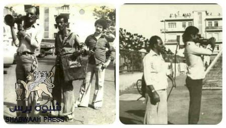 في الصورة من اليمين تغطية تلفزيونية خارجية لبرنامج المجلة الرياضية مباراة في ملعب الشهيد الحبيشي كريتر– عدن الزميل كبير المصورين الأستاذ جميل طه شاذلي ابوطه اكبر واشهر مشجع لنادي التلال الرياضي برفقة الزميل صالح طالب احمد مساعد مصور وهو من كبار فنيي معمل تحميض الأفلام السينمائية وقد بترت اصبعه اثناء عمله على آلة تحميض وتجفيف وطبع الأفلام السينمائية مقاس 16 ملم