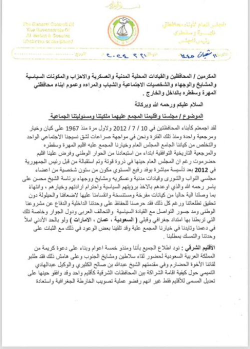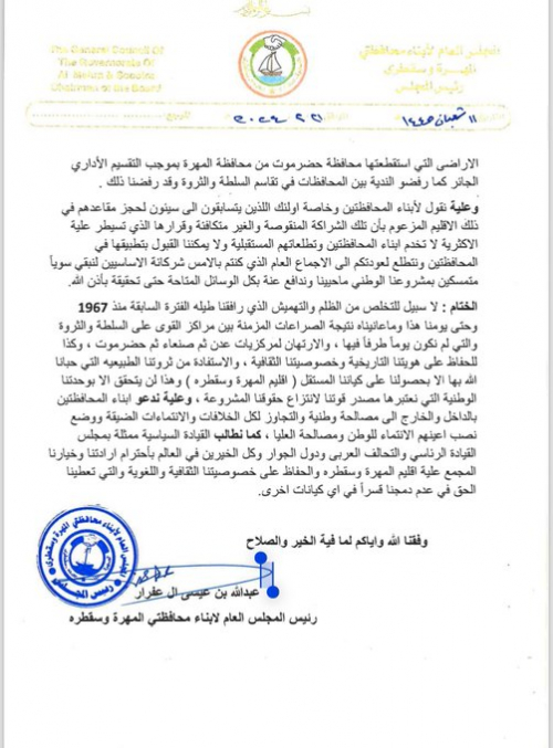 "المجلس العام لأبناء المهرة وسقطرى يرفض الأقليم الشرقي ويدعو أبناء المهرة وسقطرى للتمسك بمطلبهم #أقليم_المهرة_وسقطرى على حدود ٦٧م حفاظا على حقوقهم وخصوصيتهم اللغوية الثقافيةو التاريخية".