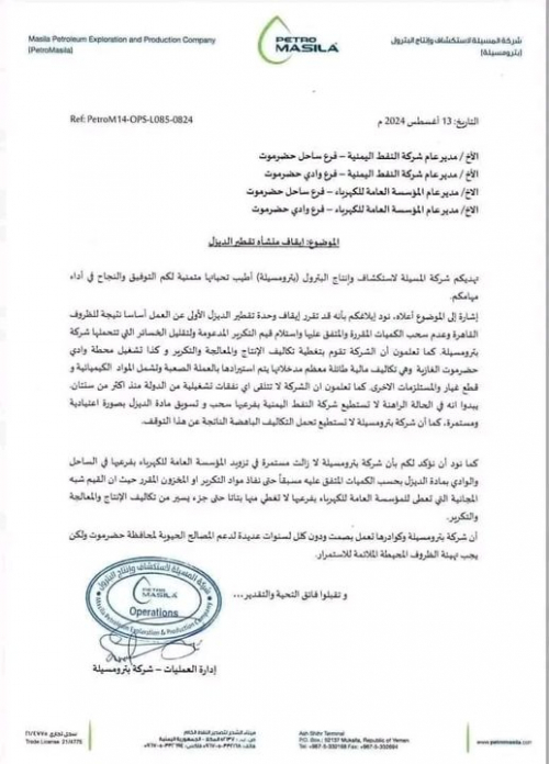 كشفت الجهات الرسمية في حضرموت عن الخطاب الرسمي الموجه من شركة بترومسيلة إلى شركة النفط اليمنية بفرعيها ساحل ووادي حضرموت ومؤسسة الكهرباء بفرعيها ساحل ووادي حضرموت ، تعلن وقف وحدة تكرير الديزل .